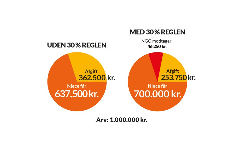 Peter og Susanne er gift men efterlader sig ikke nogen børn. De ønsker, at Susannes niece skal arve så meget af deres arv på 1.000.000 kroner som muligt, og at niecen skal fritages for at betale bo- og tillægsboafgifter. I den forbindelse overvejer de 30 procent-løsningen med Red Barnet som velgørende organisation.